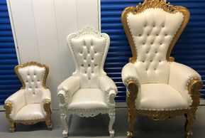 The smallest of thrones is fitting for your baby king or queen. Fits toddler to 3 years old. The middle chair easily sits a 4-12 year olds. Everyone else fits on the white w/gold trim.